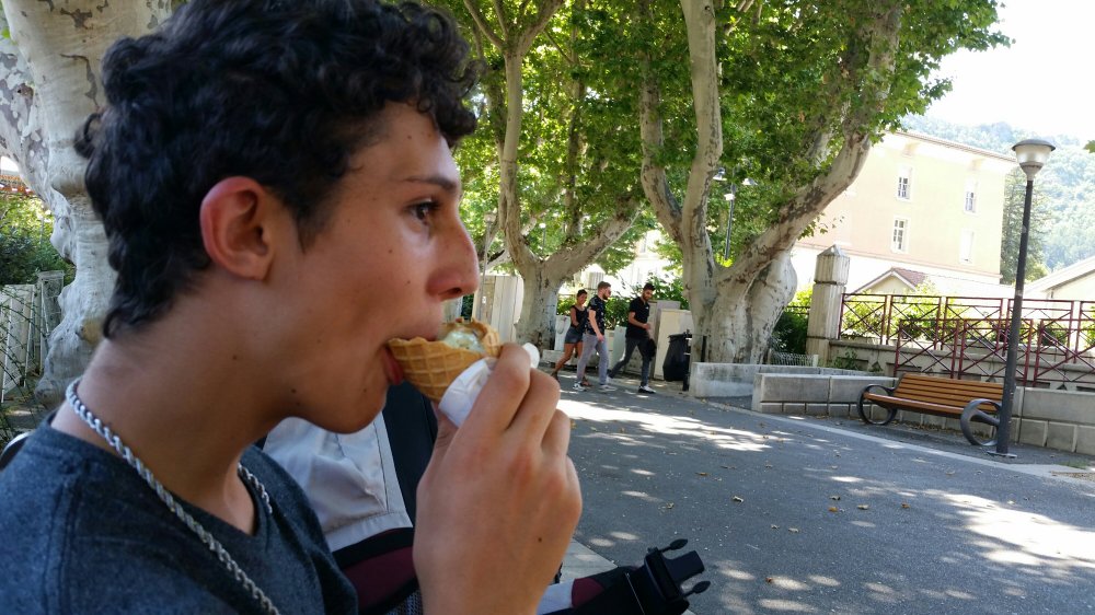 Teenager consumes ice cream and patisserie like a starving elephant. Then he abandons his old mother with all the luggage to look for an outlet to recharge his phone, which he can’t live without.