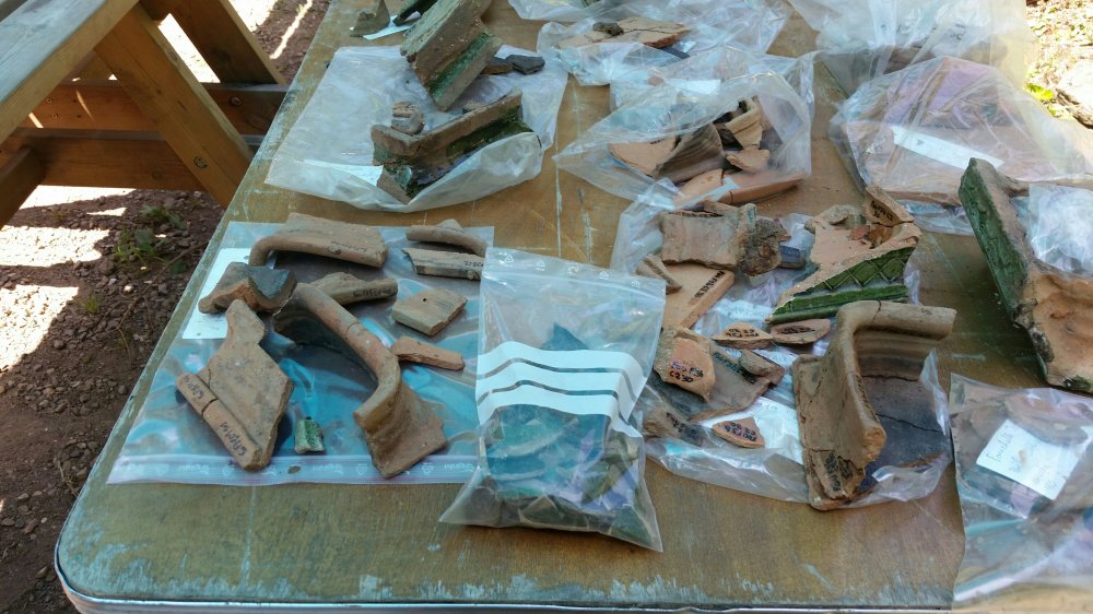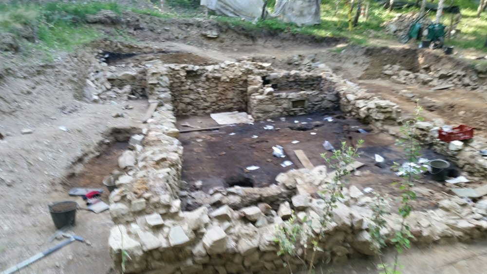 I worked at the forge, moving rocks and dirt carefully away from the outside. It felt like a treasure hunt. I found small fragments of green pottery from stove tiles, slag and some pieces of old wood posts. The inside of the forge was excavated down to a sooty black layer. There was also a mine here, last exploited in the 17th century.