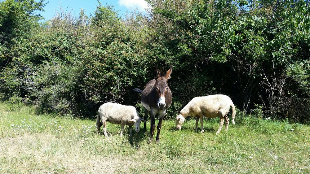 The first thing we did here was to help move the sheep and a donkey to a new pasture to make room for the caravans of a traveling acting company that was camping there.