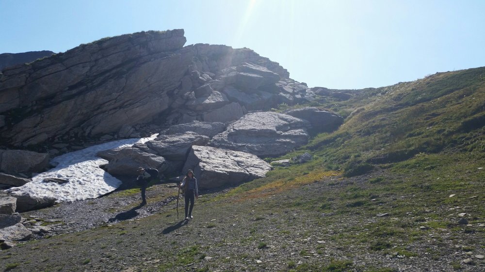 It was a beautiful place, but everyone was so tired. The Teenager and Rose got in a spat over a waterbottle, and the Teenager threw on his pack and disappeared down the trail. It was 4:00 when we finally got to the summit near the snowy peak, and crossed over the border into Italy.