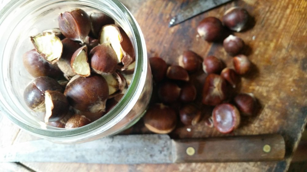First I cut the chestnuts in half with a sharp, sturdy knife.