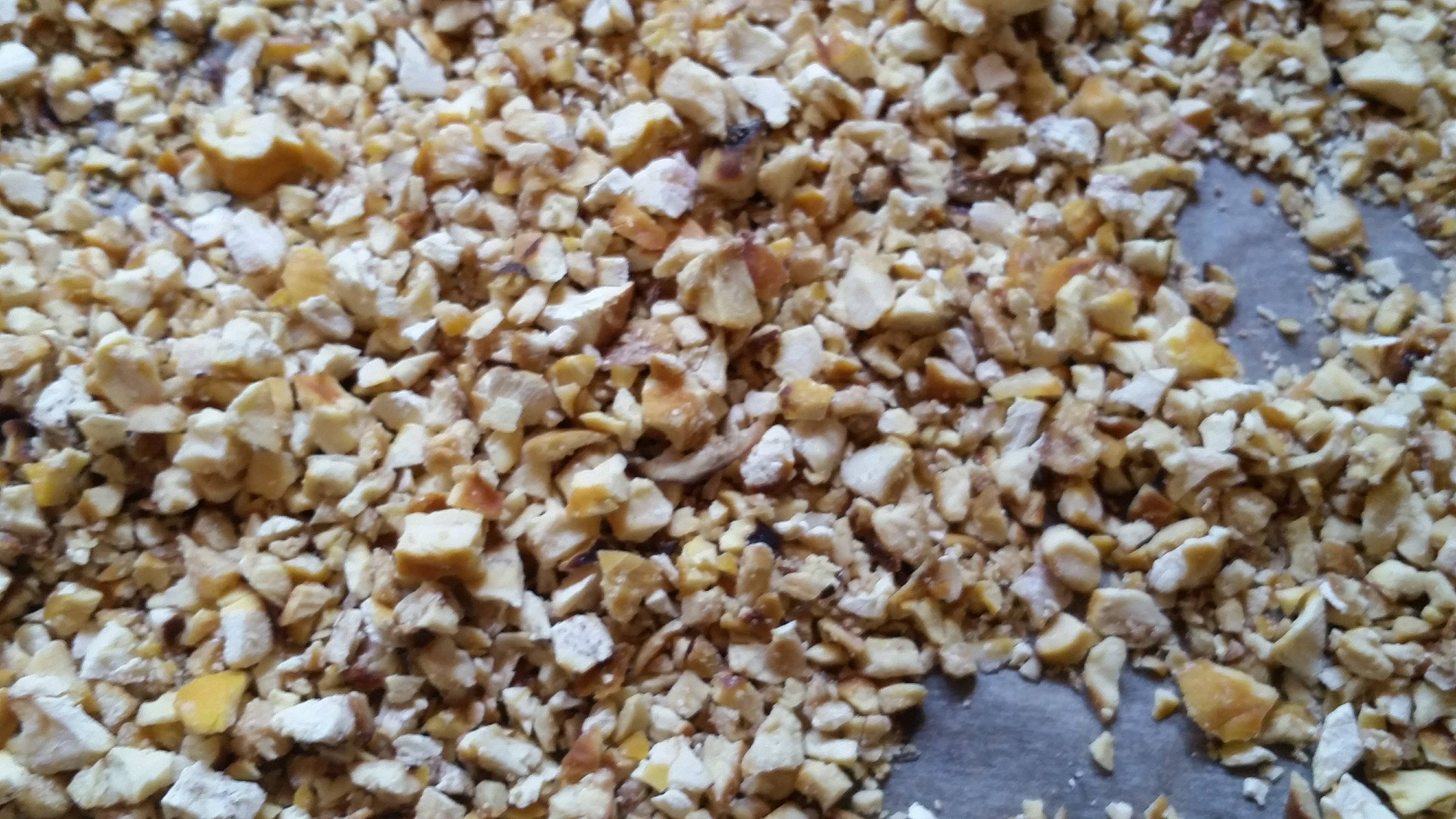 I ground the halves briefly in a food processor to get them into smaller crumbles so i could grind them in my grain grinder once they were dry.