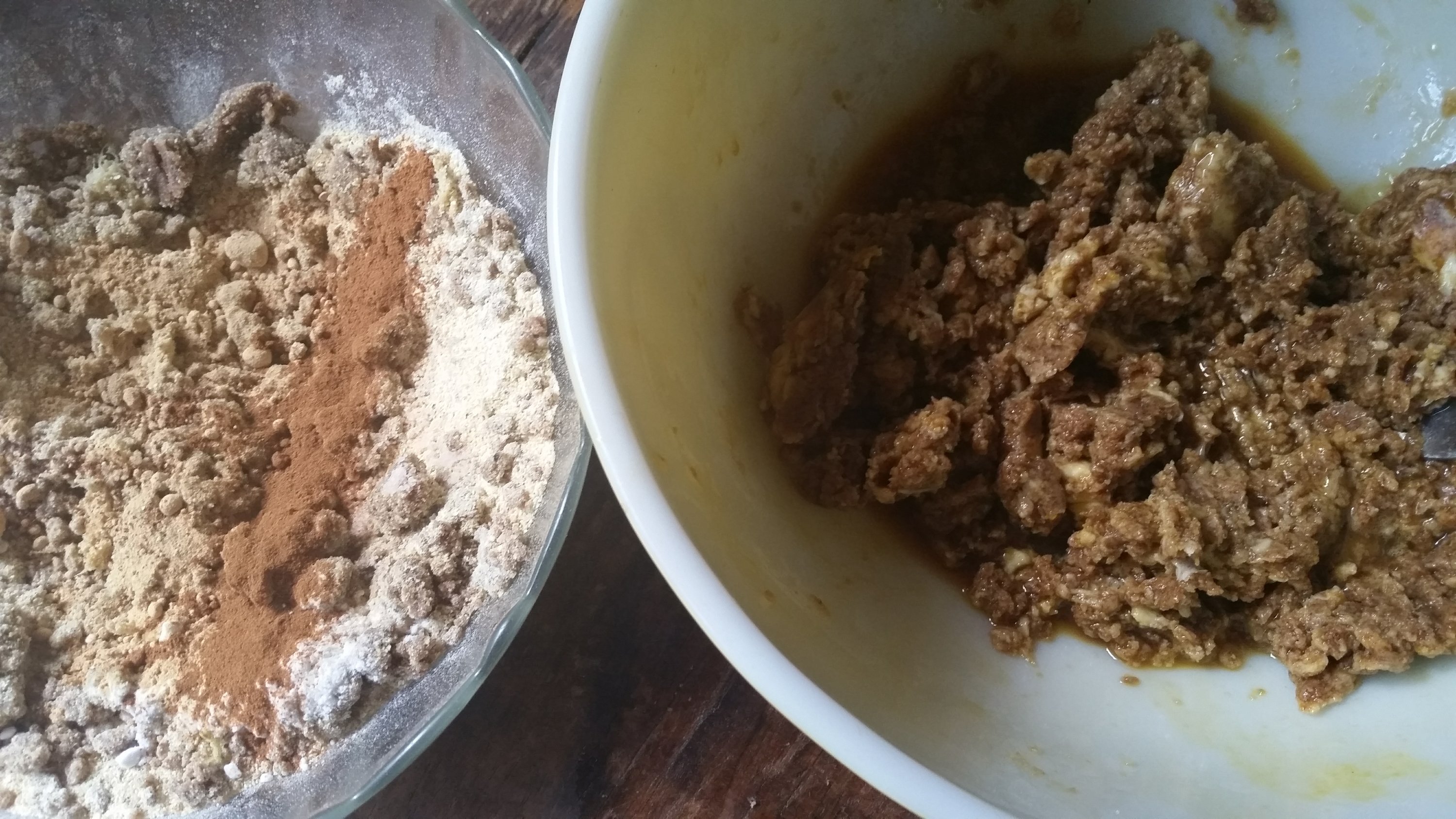 3. In a separate bowl, sift together the chestnut flour, the ground pecans, salt, baking soda, and spices.