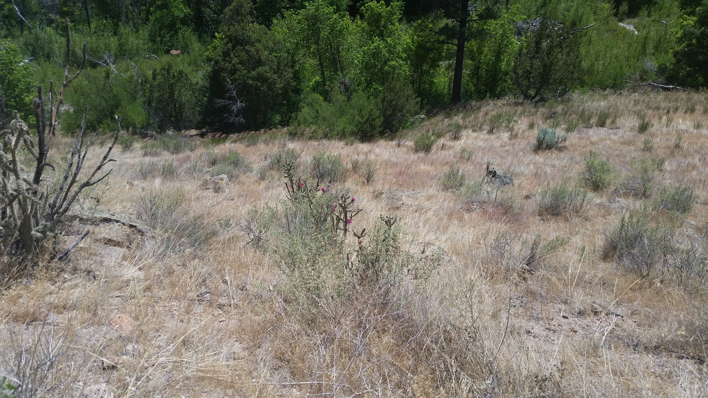 We walked for a ways through a fragrant, piney forest, crossed a creek and climbed a dry, grassy path to see the pueblos.