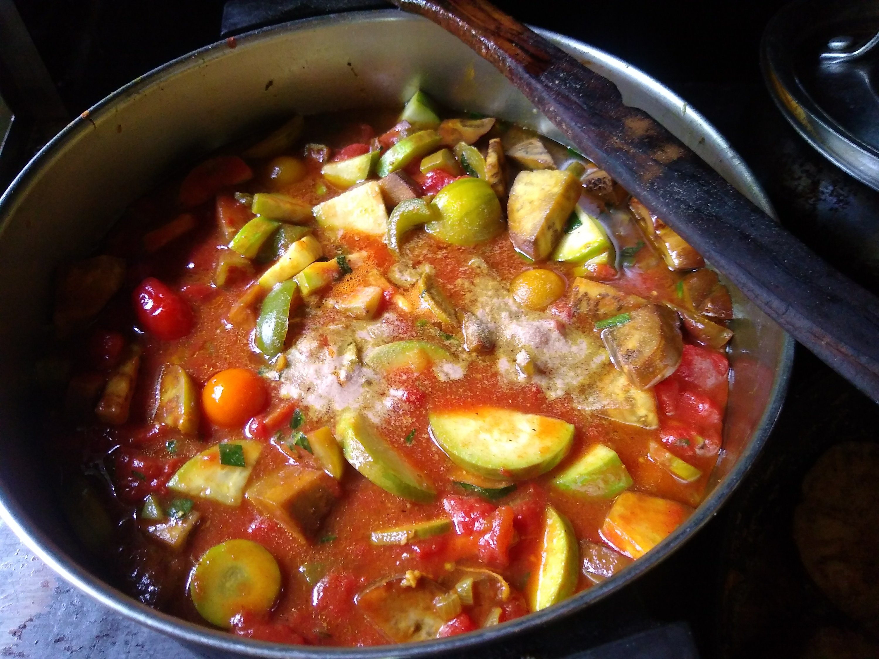 2. Add chopped eggplant, gourd/zuchini, and okra, ground coriander, ginger, turmeric, cinnamon, salt and pepper.
