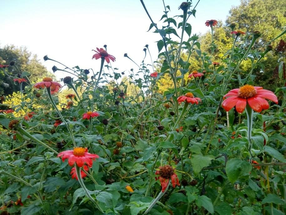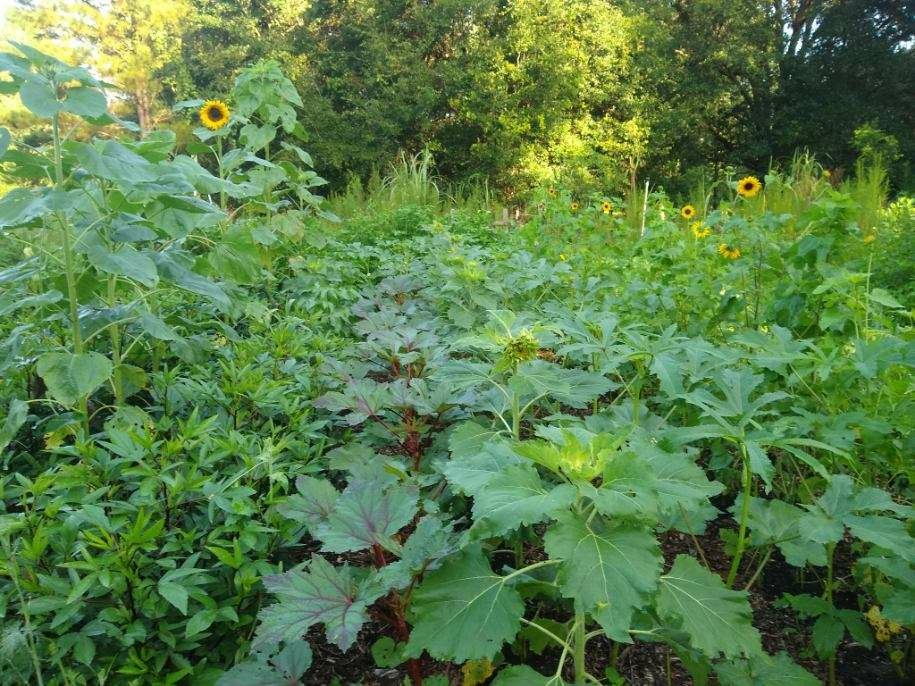 The garden is still beautiful, even in the middle of summer. This year it has been the fullest occupation of my days, and i have taken care to pull out the dead and dying plants and replant things that love late summer – okra, eggplant, sesame, basil, hot peppers, Seminole squash, cow peas, marigolds, celosia, zinnias, tithonia, and orange cosmos.