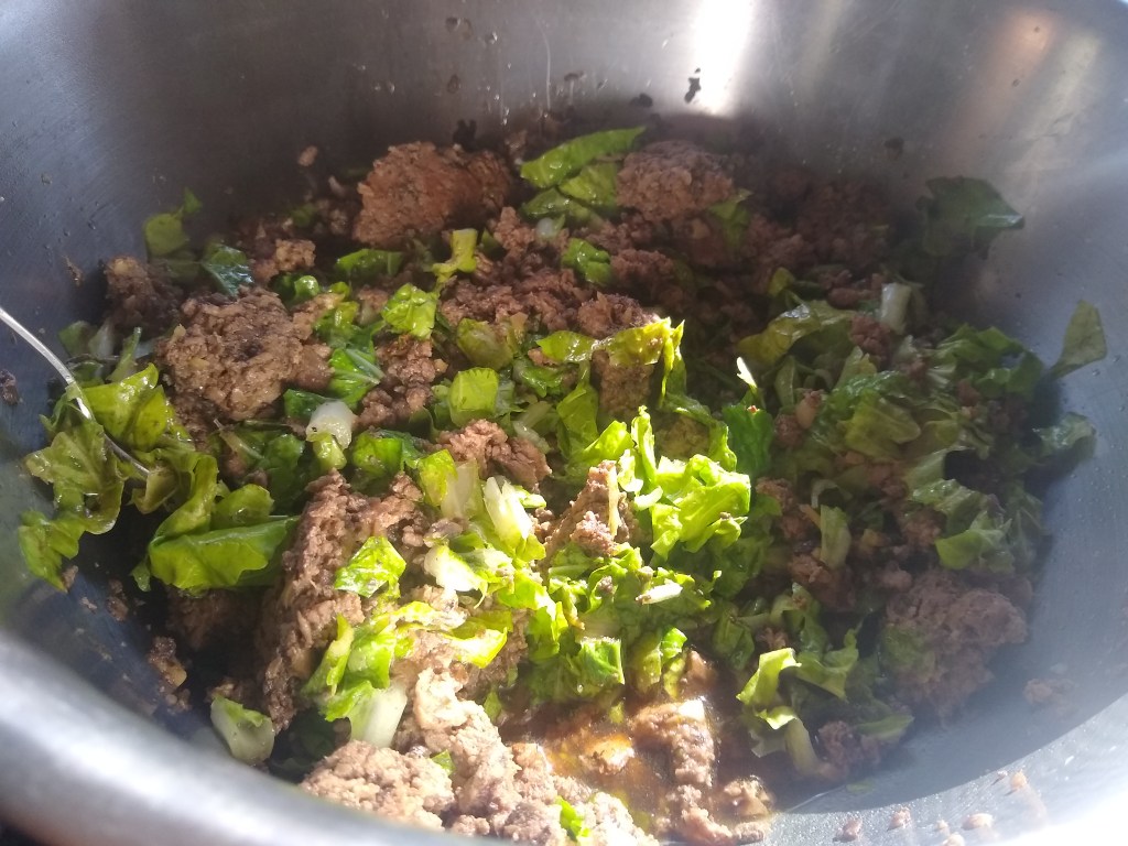 - Let it cook until the mushrooms look tender. Salt to taste, remove from heat, and pour the hot meat/mushroom mixture into the greens and stir to mix well. Let it cool while you make the wrappers.