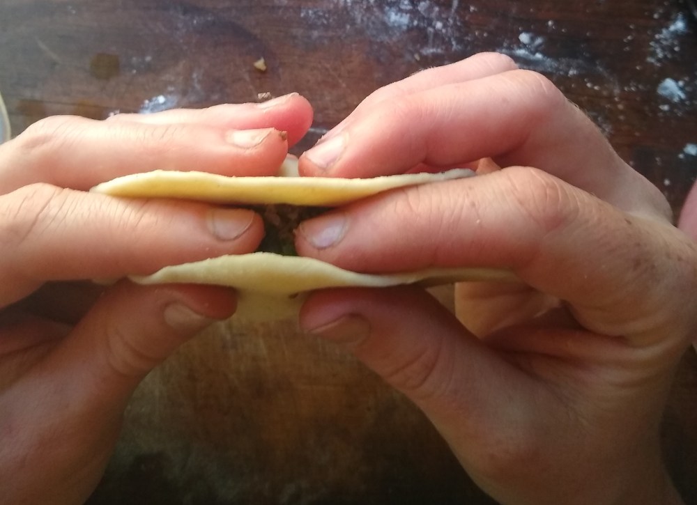 Next you crimp it closed. You start by making the first crimp in the center of the dumpling, then working along the edge to the right until you seal up the whole right half (about 3 crimps). Then head back to the center and crimp the left half. I’ll kind of give the dumpling a little squish around the crimped edge when I’m done, to flatten it for frying and help the seal hold: