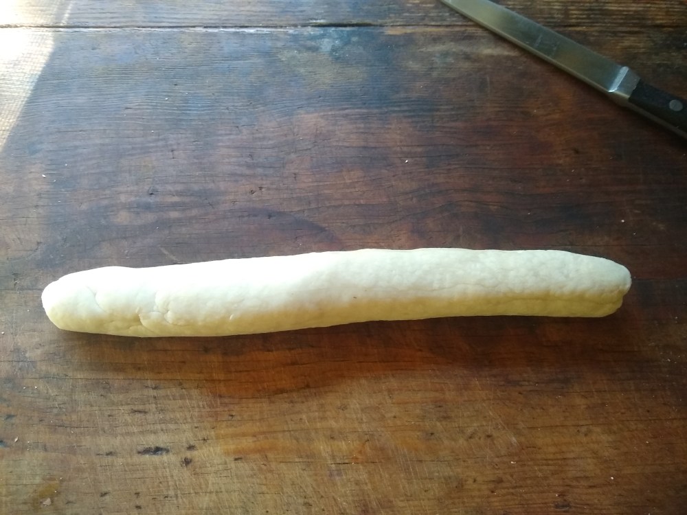 Next I form the dough into a kind of log, and cut it into thirds. I keep any dough I’m not working with in the bowl under the plate so it doesn’t dry out. Next roll one of the thirds into a longish snake: