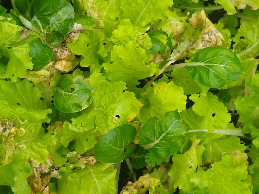Bekana is a light green Asian mustard green that looks a bit like Black Seeded Simpson lettuce. It is very tender and mild-flavored, and can be cooked or eaten in salads. People often confuse it for lettuce when they see it growing, but it has a delicious Chinese cabbage flavor. You can see the frost damage on mine in the photo. I just clip off the damaged parts, and eat the rest!