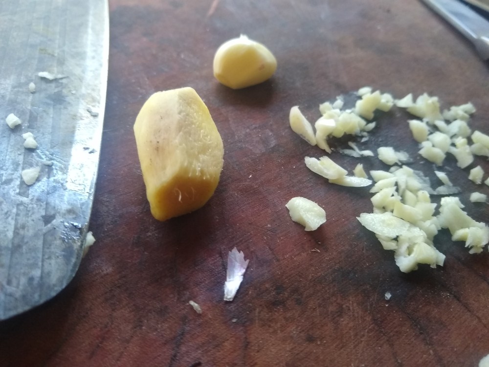 - Chop the Bekana very fine and set aside in a bowl. Remove stems from mushrooms (save them to add to stock) and chop the caps very fine (keep them separate from the greens).