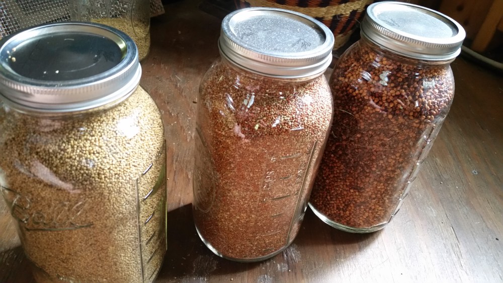 The harvests these days are so joyfully colorful – all golden and orange and blue and green and purple. They delight my eyes and feed us well. I am enjoying the work of threshing by hand. My daughters and I, sitting together on a dry spot on the deck, talking together, as I show them how to rub the grains off by hand, and run it through several sieves, sifting out the chaff. At the very end, they help me winnow with three bowls and a fan, sometimes fanning the fan for me while I carefully pour the precious grain, just so, so that the grains land in the bowl and the chaff blows out over the edge of the deck.