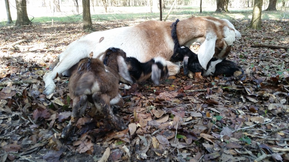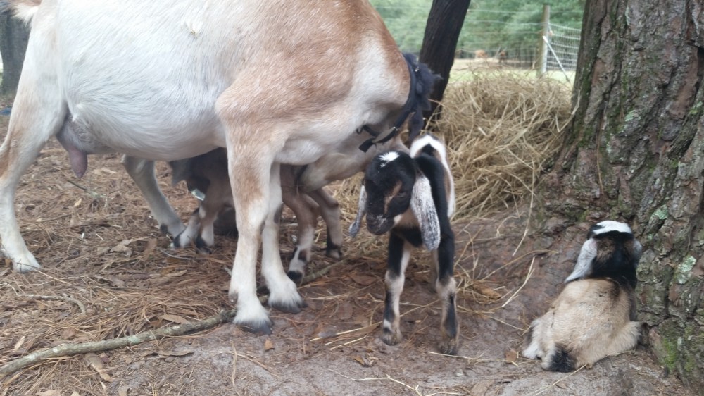 We got them all transferred to a separate paddock, to be by themselves. We made a nest for the babies under a big pine tree in the deep pine straw that they snuggled up in. I was glad to see there were no runts among the triplets. The buckling is larger than the two females, as he should be, but the girls are equal in size, and are a good size.