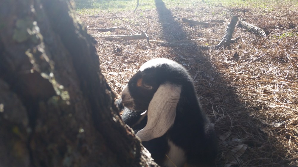 She had twins! I hated to disturb them, but knew it would be for the best, so I scooped up the little babies and tried to lure her over to the pen where Flicka was. It was unbelievably difficult, as she isn’t very bright, and we got mobbed by the other goats too, but in the end I managed to get her in and nestle the babies down in the pine straw close by. We had to wait until morning to see what they looked like!