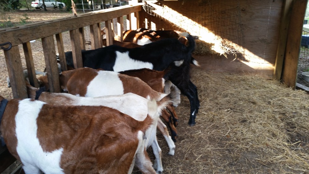 We don’t usually have kids so early. In general, the Nubians tend to start cycling in September here for Febrary-March kidding season. But the new headgate system allowed me to really keep the copper and mineral levels up in my herd this year, and I think that contributed to the increased fertility. In August, I had noticed the buck, Cookie (the black goat in the photo above – he comes in for a treat and minerals too), was in rut. It’s easy to see, since he was incredibly stinky and dripping with urine, and kept peeing on his beard (it’s a weird goat attractiveness thing). I couldn’t tell WHY he was in rut. I run all my goats together during the summer, when usually no one is in heat.