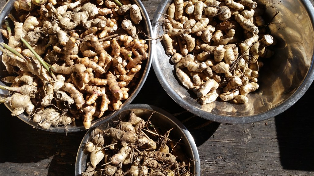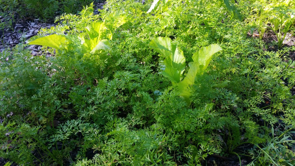 Carrots with wild mustard greens that seeded themselves from the last season!