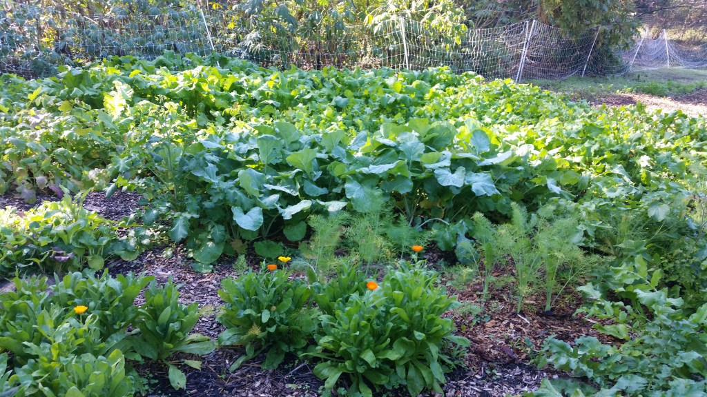 This garden began, as usual, with pigs. They did a great job rooting it up for me. I built it in sections, since I don’t plant all the vegetables for this season at once. I go for what is easy to grow when. First, right as September hits, I sow turnips, radishes, Asian greens and mustard greens. In October, when it’s starting to be more pleasant out, and less hot and damp, I start cabbage, broccoli, cauliflower, kale, kohlrabi, collard greens, and lettuce, and I seed beets, parsnips, salsify, rutabaga, and herbs like parsley, chervil, dill and cilantro. I’ll do a second planting of any of those things, or catch up if I’m behind in November and December. After December, I don’t plant any Asian greens or mustards until after the equinox. The warm/cool temperatures make them bolt very quickly.