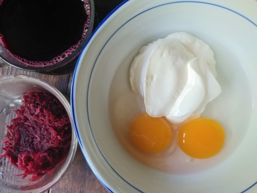 Of course I just assumed no one had thought of using beets, and I set to work modifying and combining several different recipes at once to use cooked, shredded beets. Rose had an anxiety attack while hovering over me in the kitchen, watching me measure things out and then add dashes of more. She likes to follow directions exactly – which is generally a good practice.