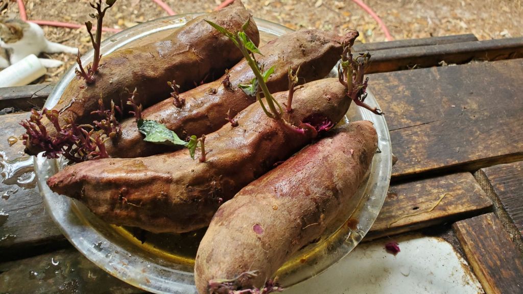 I am thinking ahead to the next season, because that is always key to having enough in the moment. This hot, damp summer time is wonderful for sweet potatoes, and I am still planting lots of slips, whenever and wherever I can. Sweet potatoes are great for people and livestock.