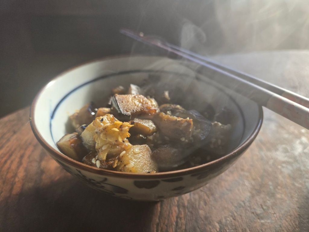 3. When the eggplant looks brown and crispy (but not burned), remove from heat and sprinkle with sesame seeds.