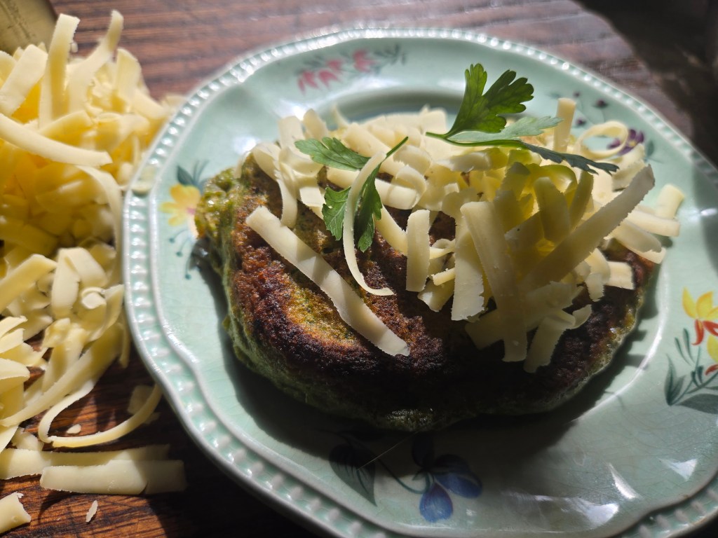I looked at my bowl of eggs and big bunch of spinach, and thought… how hard would it be to turn it into pancakes? Savory pancakes, served with grated cheese? All blended up (and making use of 5eggs! Yay!), so she won’t even notice the vegetables? Not hard at all!