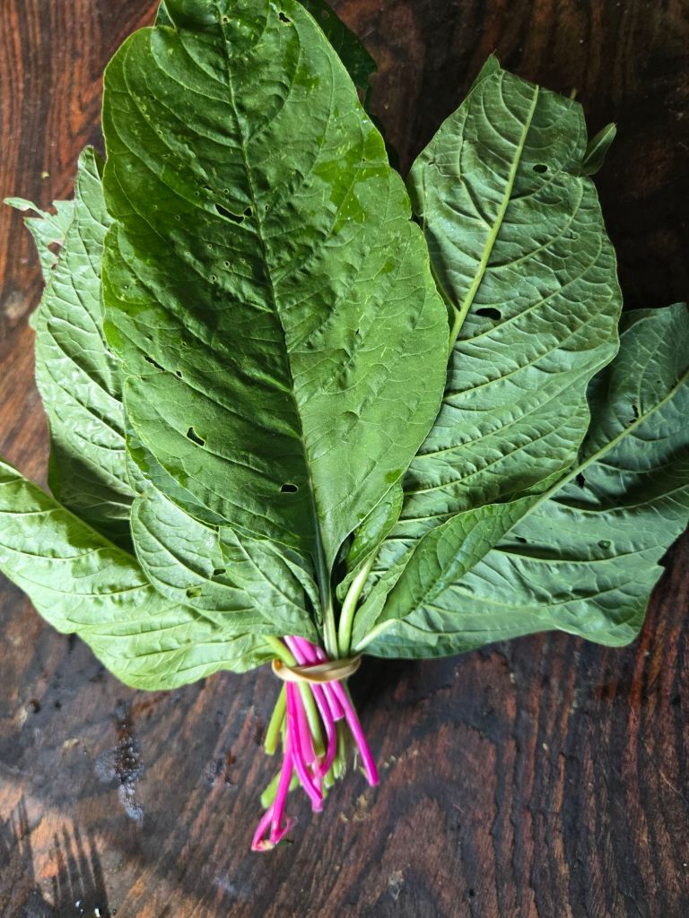 Apparently any amaranth leaves can be eaten, even the thorny wild one if you’re so inclined, but some are better eating quality than others. I love the large-leafed Callaloo variety from the Southern Heritage Seed Collective locally (also available from Southern Exposure Seed Exchange). This pretty pink-stemmed one is from Baker Creek, but I’ve grown many kinds of amaranth and the leaves are pretty equally tasty. The mayo Indian red amaranth was a weed in my old garden! Adaptive Seeds also offers some gorgeous varieties of amaranth. It’s great to have a multi purpose crop with greens and grain from harvesting!