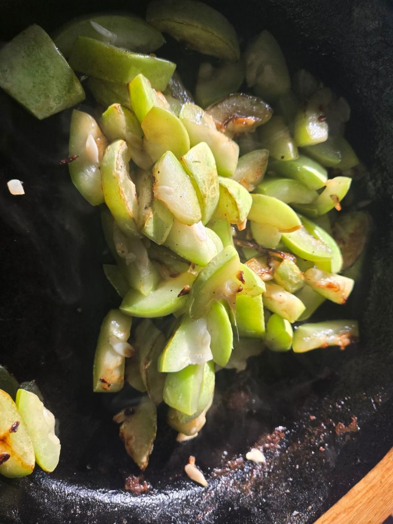 Cuccuzi gourds come to the rescue in the late summer – delicious, productive, easy to grow. Start seeds in April. Have a big, sturdy trellis! Vines get huge. Pick them young and tender. Here is a favorite recipe. I recommend serving with sky blue sticky rice!